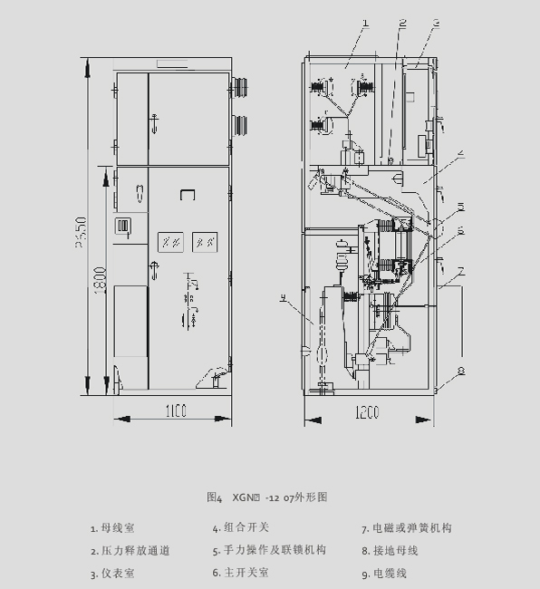 3. 電纜室在柜體下部的后方,電纜室內(nèi)支持絕緣子可設(shè)有電壓監(jiān)視裝置,電纜固定在支架上,對(duì)于主結(jié)線為聯(lián)絡(luò)方案時(shí),本室則為聯(lián)絡(luò)電纜室。繼電器室在柜體上部前方,門上可安裝指示儀表、信號(hào)元件等二次元件,頂部還可布置二次小母線。