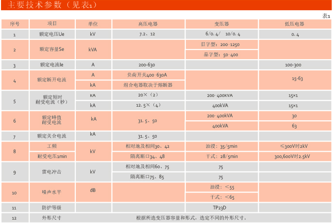 本產品由高壓配電裝置變壓器及低壓配電裝置聯接而成,分成三個功能室,即高壓室、變壓器室和低壓室,高、低壓室功能齊全,高壓側一次供電系統,可布置成環網供電、終端供電、雙電源供電等多種供電方式,還可裝設高壓計量元件,滿足高壓計量的要求。變壓器室可選擇S7、S9、S11以及其他低損耗油浸式變壓器和干式變壓器;變壓器室設有自起動面板或柜裝式結構組成用戶所需供電方案,有動力配電,照明配電、無功功率補償、電能計量和電量測量等多種功能,滿足用戶的不同要求,并方便用戶的供電管理和提高供電質量。